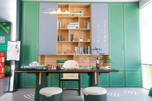 「云栖竹韵」系列定制书柜清新健康的“一抹西湖绿”使得每一位观众驻足欣赏,在这个空间中感受到绿色健康的理想居所与美好生活。