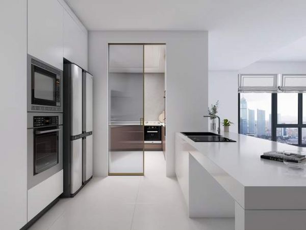 大部分的厨房都连接着客厅,安装了长虹玻璃全景门的厨房,将与客厅空间进行隔断,创造了半开放式家居空间。极窄的边框增加了透光面积,而半透明的长虹玻璃则让空间显得更纯粹利落,而又不失简约大气。