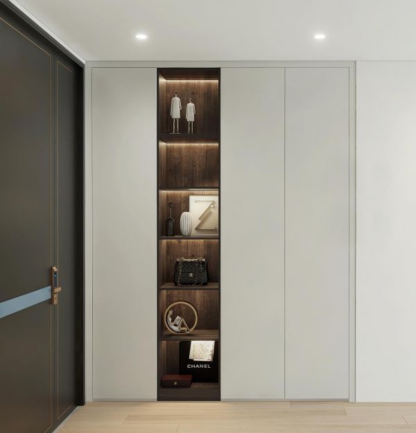 入户处内嵌顶天立式玄关柜,按压式柜门没有把手,简约又大气。为了避免看起来太过简单,设计师特意做了一竖列的开放格设计,深色的置物格与整个玄关柜形成对比,让进门空间更有层次感,内置灯带更是轻盈灵动。