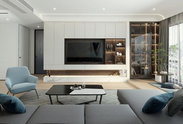 整墙电视柜线条明朗流畅,开放式深棕色置物格+下方挖空设计让空间层次更丰富,搭配大理石,更显格调质感。