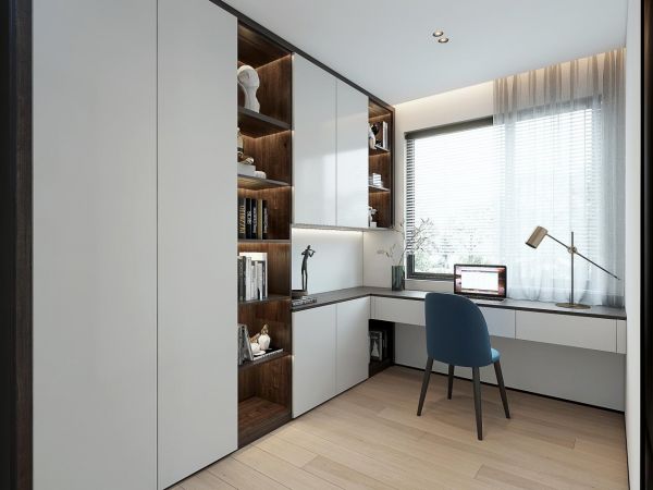 书房面积虽小,但却是姚女士非常在意的办公空间。设计师靠墙定制整墙书柜,半开放式设计能储物也能放下姚女士常用的书籍和能带给她灵感的艺术品摆件。