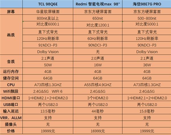 在价格方面,小米以16999元成为最低价,TCL 98Q6E和海信98E7G PRO价格为19999元。Redmi智能电视MAX 98在价格上一直有优势,但它的亮度、对比度、刷新率、杜比音画、声道、音响、CPU、HDMI、输入延迟等方面较其他两款逊色,这样的价格也是理所应当。