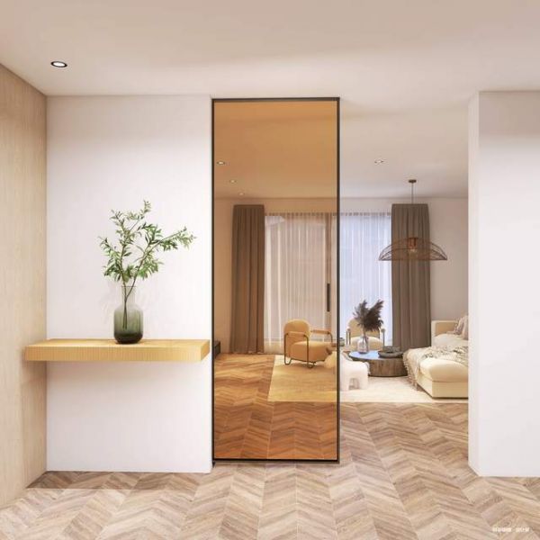 在以德立全景门为核心的家居设计中,本案例中主体采用茶色玻璃,既保有传统中式的文化调性,又有年轻跳脱的时尚质感,极简而纯粹,宁静而优雅,色彩递进营造出空间的层次感,重新定义非凡的设计格调,打造高颜值家居。