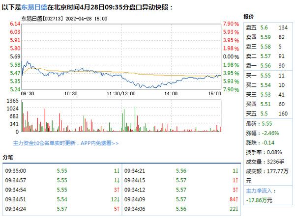 新浪家居讯 4月28日,东易日盛盘中快速反弹,5分钟内涨幅超过2%,截至9点35分,报5.55元,成交177.77万元,换手率0.08%。