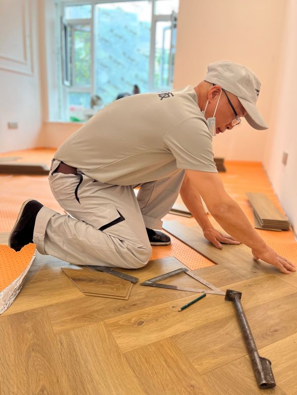 采访当天,段文勇龙玉梅夫妇接到的是一户110平米的“大工程”,全屋需要人字拼,客户要求先铺装卧室,在家具进场后,再铺贴客厅餐厅等其他区域。相比地板直铺,人字拼对工艺的要求更高,一个熟练的安装师傅,一天最多能铺15-20平米,段文勇龙玉梅夫妻两人一起开工,110平米的地板,也需要至少两天时间才能完成。要是遇见异型的房间,铺装的工期会更长一些。因此,段师傅说,地板铺装是一项又要动手又要动脑的工作,来不得半点粗心和马虎,更没有“将就”。