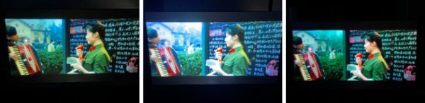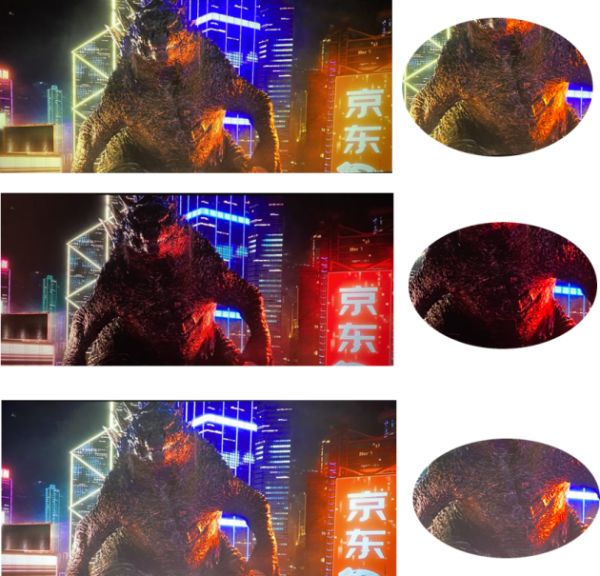在《哥斯拉》这部影片中,我们可以仔细观察下黑暗场景下哥斯拉的细节,图一的暗部细节比较丰富,而图二色彩过于浓艳导致暗部丢失了很多细节,这就是三色激光电视未经色彩调校会出现的状况;图三的暗部细节虽然也比较丰富,但整体呈现发白的情况,这是一味追求亮度而牺牲色彩的画面效果。色域过广不加以校色,或只注重拔高亮度,都会导致画面色彩以及细腻程度的损失。