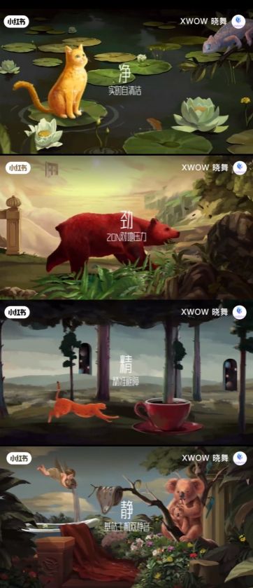 清洁机器人行业营销大多数还停留硬核的功能展示和直白的达人带货上,而作为才成立一年有余的XWOW晓舞却在行业里掀起一股“文艺风潮”,将居家元素与大自然场景结合,运用超现实主义绘画风格,把四种动物的天赋与晓舞洗地机器人的四大核心功能巧妙关联,描绘出产品特性。