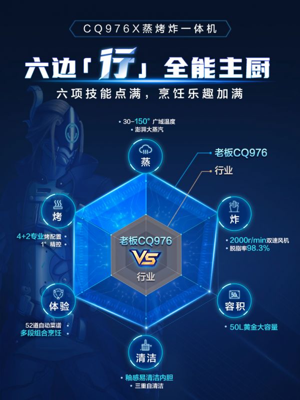 想要吃的健康,有两点需要格外关注:第一是要选择天然健康的食材,第二则是要注重食材的烹饪方式。好在这一点上,老板电器六边“行”全能主厨CQ976蒸烤炸一体机已经替你考虑到位。