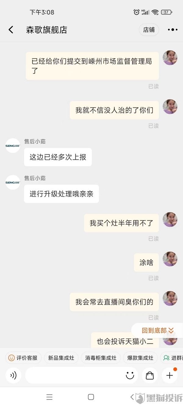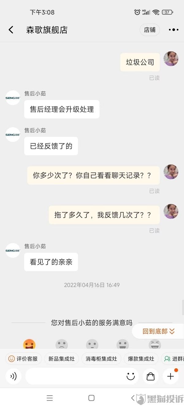 据黑猫投诉平台显示,6月7日,网友天宗200108投诉,森歌“服务不到位,三包问题,售后不处理”,据聊天记录显示,报修半年之久,森歌仍无法安排售后服务。