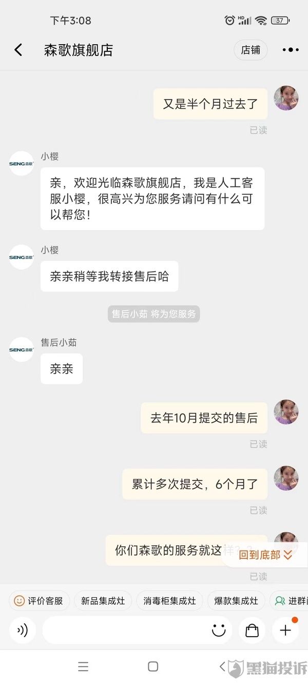 网友投诉森歌集成灶售后堪忧,报修半年之久,仍无法安排报修服务