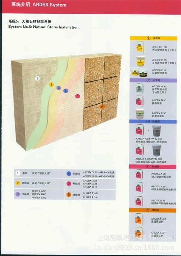 粘结强度高,抗滑移能力强:适合粘贴大规格的文化石等,低收缩率精选级配骨料,避免自身收缩导致瓷砖剥落。