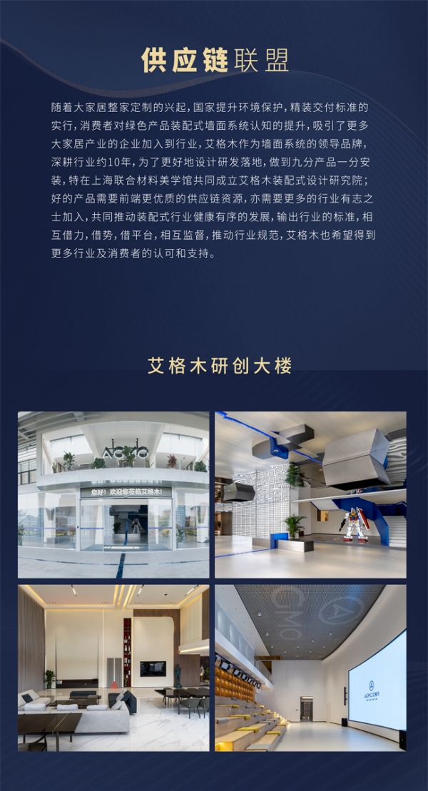 随着大家居整家定制的兴起,国家提升环境保护,精装交付标准的实行,消费者对绿色产品装配式墙面系统认知的提升,吸引了更多大家居产业的企业加入到行业,艾格木作为墙面系统的领导品牌,深耕行业约10年,为了更好地设计研发落地,做到九分产品一分安装,特在上海联合材料美学馆共同成立艾格木装配式设计研究院;