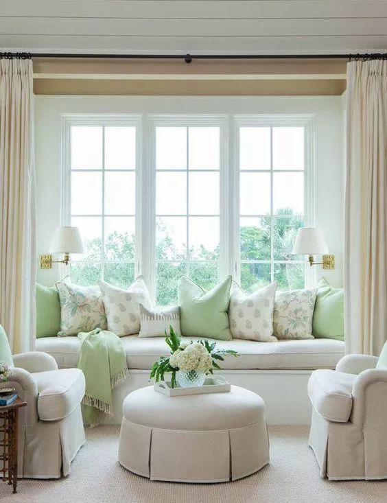 如果飘窗所在的空间比较大,可以将窗帘靠墙,纱窗或者百叶窗靠窗,不仅可以隔出一个独立的窗帘区,也可以让整个空间看起来更大气,整洁。而纱窗或者百叶窗靠着飘窗,不仅仅可以让飘窗上的柜子抱枕等不容易被晒褪色,看起来也更加的美观。
