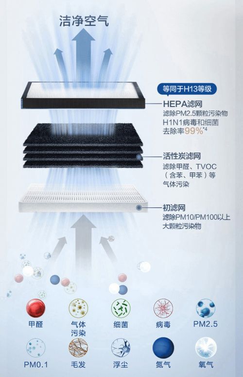 A.O.史密斯空气净化器搭载长效分级过滤系统,初滤芯可滤除PM10、PM100以上的大颗粒污染物;活性炭滤网可滤除甲醛、TVOC(含苯、甲苯)等气体污染;HEPA滤网可滤除PM2.5颗粒污染物、H1N1病毒、细菌等。