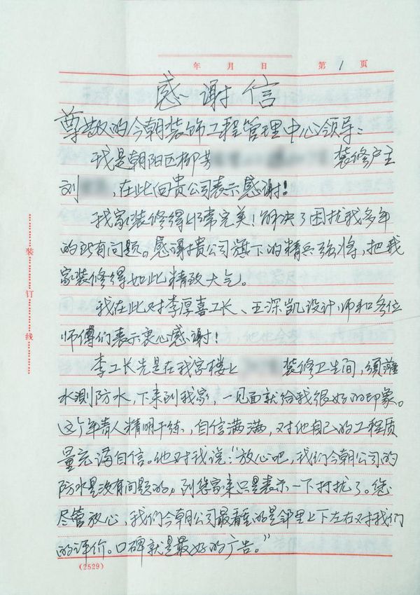 来自业主的感谢信,让我们更加清楚消费者需要我们做什么