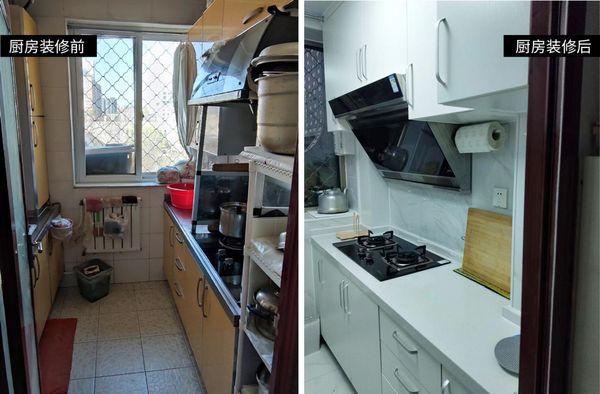 卫生间高台、墙砖起鼓、下水不通、烟道堵塞、灯具损坏等等一系列老房问题集中在了业主的厨卫中,李工长一眼就把这些问题都发现了。在不影响业主居住的情况下进行厨卫装修,还把业主家的保护做到位,最后完工书架上的书都做到了一尘不染。