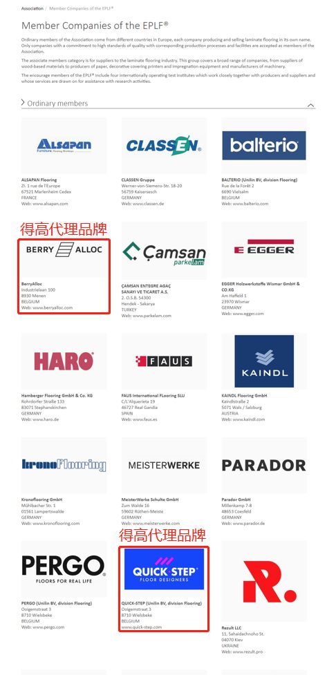 欧洲强化木地板协会(EPLF),是代表欧洲主要木地板制造商和研究机构的一个组织。在国际贸易中,EPLF标志已经成为公认的代表强化复合地板质量的标志。只有全球销量排名前列的地板品牌才能成为EPLF成员。它规定了强化复合地板的特性、要求和测试方法,源于比利时Unilin集团的得高Quick-Step作为其创始成员之一,其产品质量及创新技术更是行业内标杆性的存在。