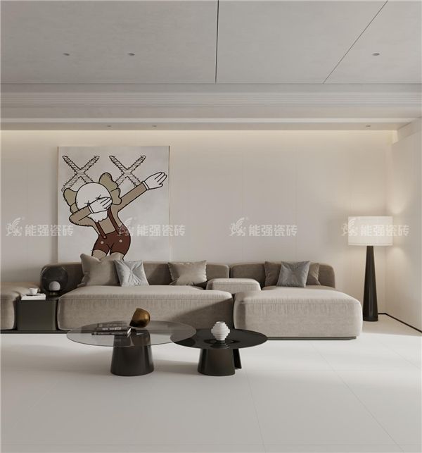 强调材质与触感,弱化颜色的对比,采用米色系沙发与干练造型的茶几,加入潮流icon KAWS挂画,给人放松与惬意的感觉。