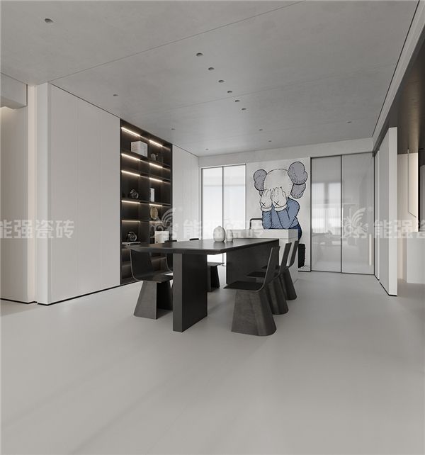 无主灯设计+黑木质餐桌现代感十足,大型的KAWS装饰画极具潮流感,成为整个餐厅空间的视觉中心。