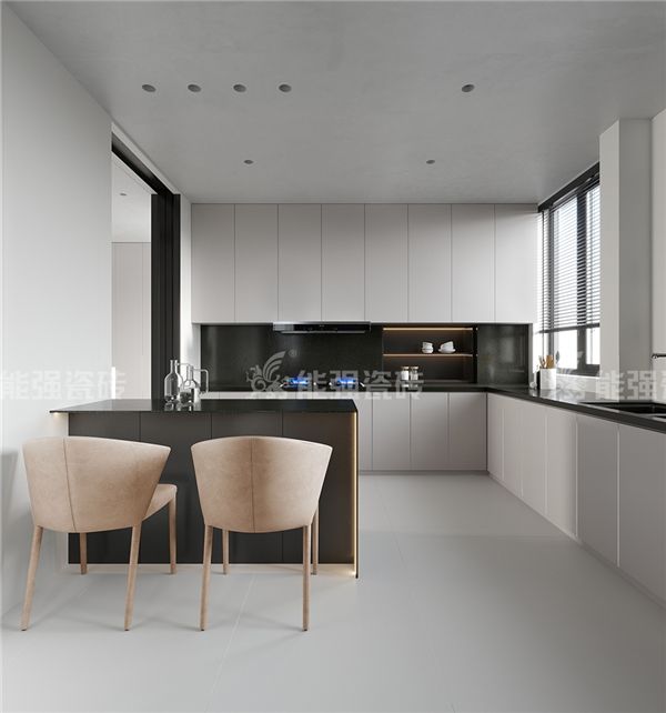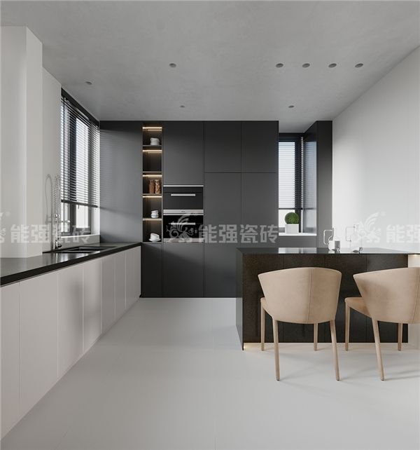 黑白灰色调的厨房给人一种沉稳的感觉,岛台的存在让空间更加立体。隐藏起来的强大收纳空间让厨房的功能发挥到极致。
