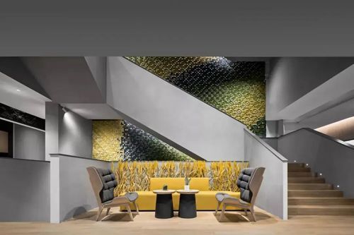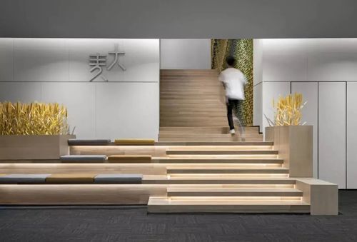 首层大堂入口为两层挑空结构,大堂区域宽敞的行走区域保证访客和员工能自如流动。三个楼梯分别为折跑形式的拾光中庭楼梯,拾级而上的大麦中庭楼梯以及旋转的鲸喜中庭楼梯,缓解整个办公区上下交通的运行压力,创造更加高效便利的办公环境。