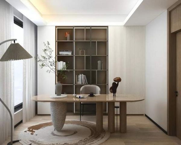 “其实客厅这样的搭配是有些偏侘寂风了,而卧室更偏向简约风,像是书房区域男主人用得比较多,所以风格上、软装家具的选择上都比较偏向新中式,而且专门做了个展示收纳柜,男主人喜欢的一些收藏品都可以放在这里。”