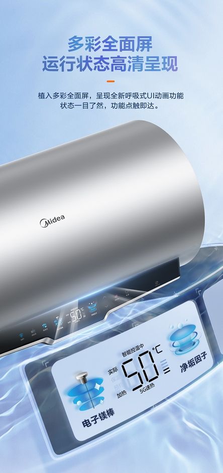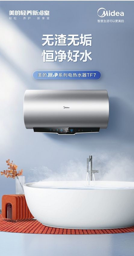 电热水器作为现代家庭的标配,其使用寿命、水质健康、加热速率等关乎人们的沐浴品质生活。然而传统电热水器镁棒消耗,会产生大量镁渣水垢,不仅影响水质健康,而且还会腐蚀内胆造成漏水,给用户沐浴生活带来很大困扰。为了解决用户痛点,美的颠覆技术革新,创新推出恒净电热水器TF7,搭载电子镁棒无渣无垢黑科技、智能监测杀菌、多彩全面屏、3200W涡旋速热、9倍增容大水量等诸多创新科技,轻松解决镁棒频繁更换、水质健康、热浴加热慢、储水容量小等难题,为用户带来恒净好水质,开启健康净肤沐浴新体验。