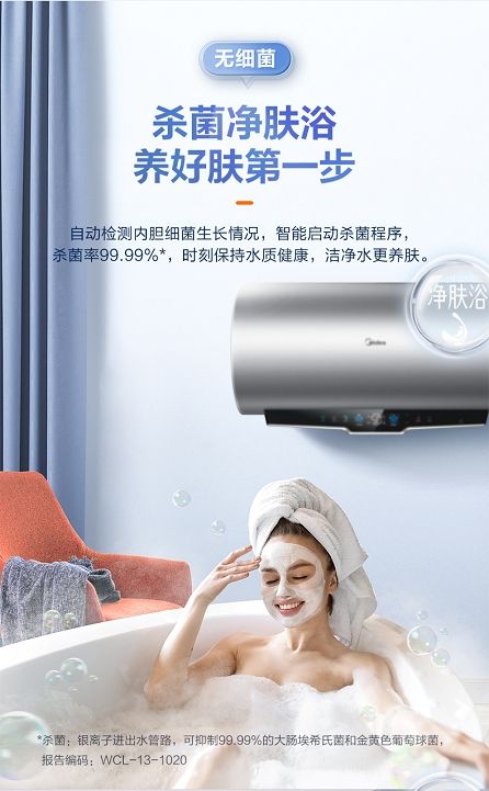 为了解决水质健康问题,美的恒净电热水器TF7能自动检测内胆细菌生长情况,智能启动杀菌程序,可有效杀灭大肠埃希氏菌和金黄色葡萄球菌等常见致病细菌,杀菌率高达99.99%,从而时刻保持水质洁净,全天候为用户健康保驾护航!