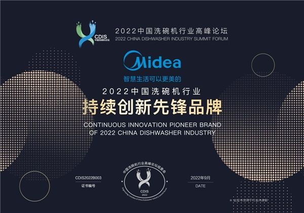 美的荣获“2022中国洗碗机行业持续创新先锋品牌”奖