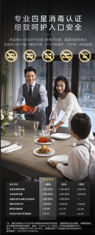 配有四星级消毒认证,搭载高温煮洗+专利105°热风烘干除菌+银离子抑菌,重重除菌消毒洗,可去除99.99%的幽门螺旋杆菌、H1N1病毒等,守护家人肠胃。