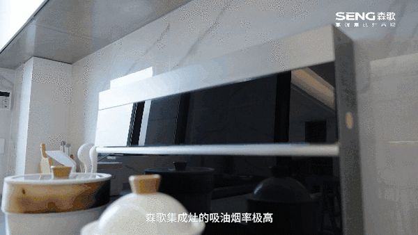 因为是半开放式厨房,所以集成灶的吸油烟能力格外重要。经过考察对比,全女士最终选择了森歌集成灶。A8蒸烤一体款采用侧吸下排的方式,搭载直流变频无刷电机的一体式静音风道,净烟率达到99.96%以上,完美解决白色小厨房容易沾上油烟的后顾之忧。
