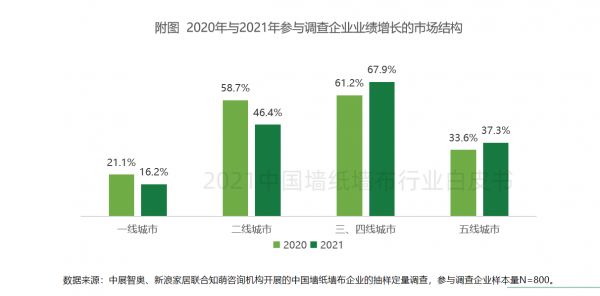 尤其是三四线乃至五线城市,这样的线下优势会更加突显,从2021年墙布企业的增速分布区域我们也能够窥得一二。据调查显示,相较于2020年,2021年墙布企业业绩增长在三、四线以及五线城市均有所提升,其中,2021年67.9%的墙布企业在三、四线城市实现业绩增长,37.3%的墙布企业在五线城市实现业绩增长。