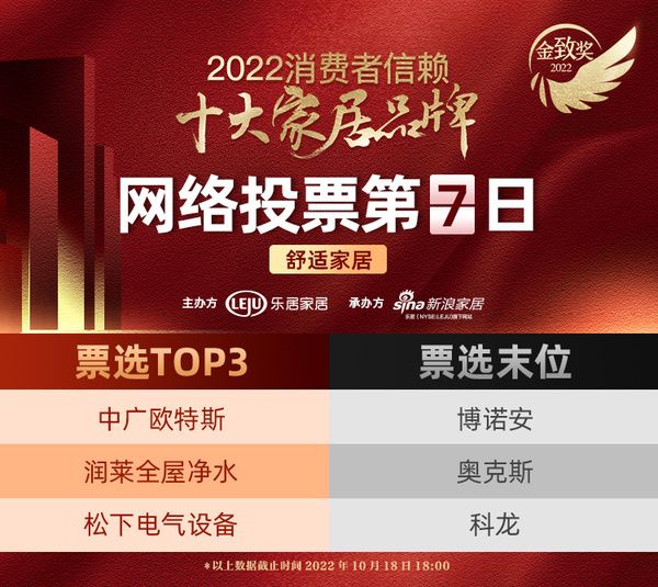 网络票选第七日战报出炉,最终中广欧特斯、润莱全屋净水、松下电器设备,获得2022消费者信赖十大家居品牌舒适家居品类前三甲。