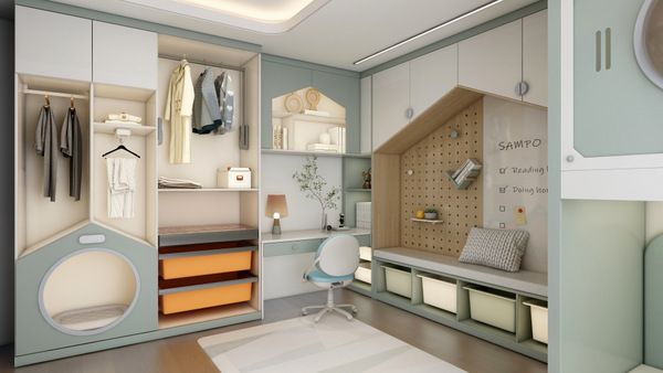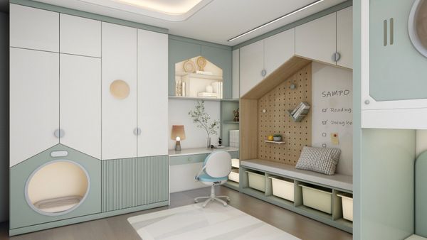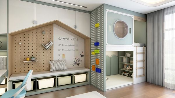 在造型上要想满足孩子的个性需求,增添新材质的使用,也能使空间整体风格更和谐,也能增加透明式收纳,家长一眼能看出孩子收纳习惯,进而培养孩子良好居家习惯。