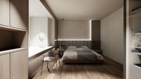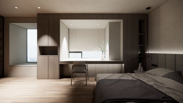 床头内嵌开放储物柜与窗台隔断收纳柜