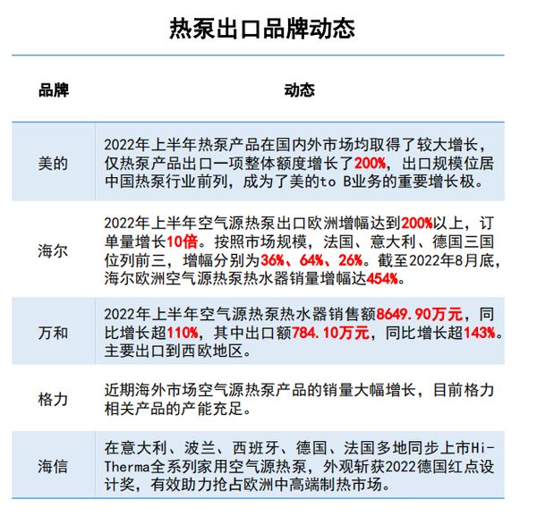 此外,海信也在意大利、波兰、西班牙、德国、法国多地同步上市Hi-Therma全系列家用空气源热泵,外观斩获2022德国红点设计奖,有效助力抢占欧洲中高端制热市场;美的2022年上半年热泵产品在海外市场亦取得了较大增长幅度,仅热泵产品出口一项整体额度增长了200%,出口规模位居中国热泵行业前列,成为了美的to B业务的重要增长极。