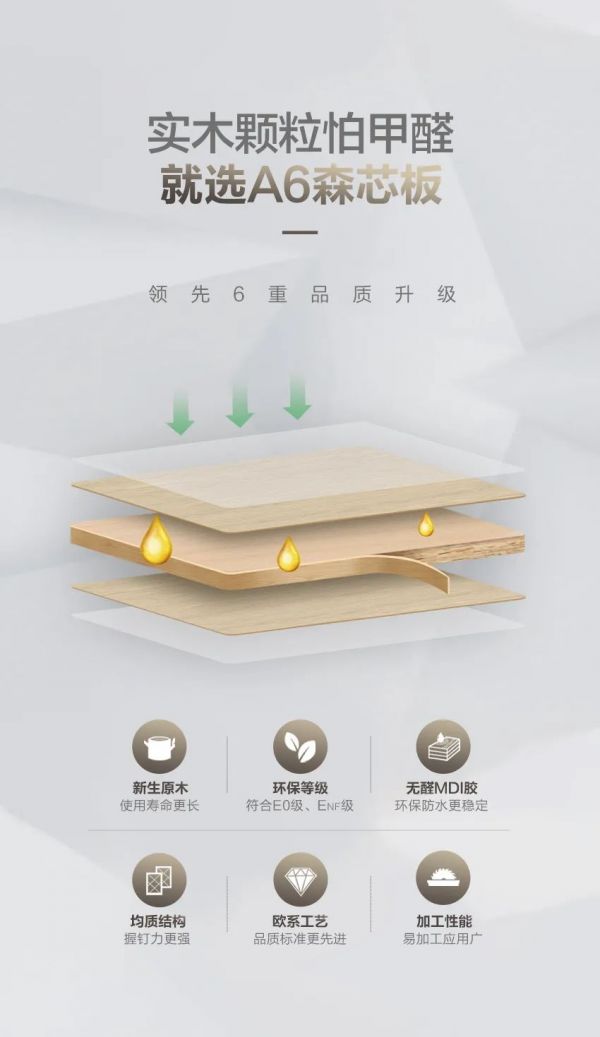 其中,A6+森芯板是增加抗菌、防霉功能的升级产品,健康更有保障。相比市场上其它同类产品,A6及A6+森芯板系列产品率先达到最新国标ENF级环保标准。