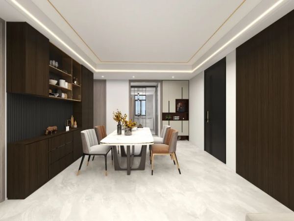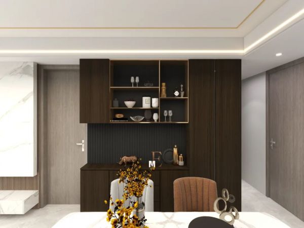 进门的一边是客餐厅,采用榆木苏影(花色)做几乎对称的墙体和餐边装饰,大方规整,为空间增添些许清净雅逸的视觉感受。