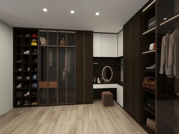 L型走入式衣柜,精准储物和分类,整整齐齐。美观的同时兼具展示需求,实现卧室收纳效果的最大化。