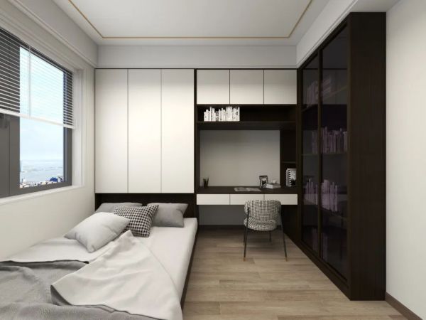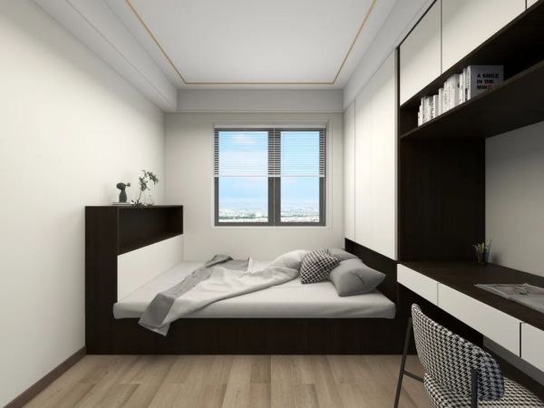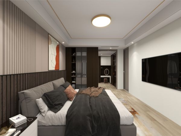 卧室的氛围原则要色彩饱和度低、光线明暗适中,便于放松和健康睡眠。整体以灰棕打底,柔软的床饰、被套及格栅背景墙,色调相近,营造都市归家后的惬意。
