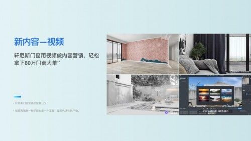 营销板块,针对短视频流量崛起,酷家乐进一步强化渲染视频功能,提供模板视频、生长动画、漫游视频等多种视频展示形态,满足门窗企业布局新媒体的需求,抢占流量资源,实现引流获客、营销增长。