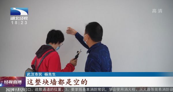 对于墙面空鼓一事,在《经视直播》记者的协调下,金地新家决定派人前往施工现场检查。该公司交付负责人汤经理表示,修是可以修,但是杨先生家原来的墙体结构是空心的,砖跟砖之间也有缝隙,可能解决不了空鼓的问题。
