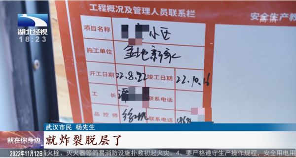 据《经视直播》报道:近日,市民杨先生的房子装着装着就停工了,眼看都过了交房日期,还没有完工的迹象,而且在水电开槽、墙面空鼓等问题上无法与施工方深圳新诚天建筑工程有限公司武汉分公司(下称“金地新家”)达成一致,杨先生希望哪里有问题装修方就帮忙维修好,双方却沟通不太顺畅,杨先生不愿意支付尾款导致工地停工,于是拨打湖北经视热线电话求助协调。