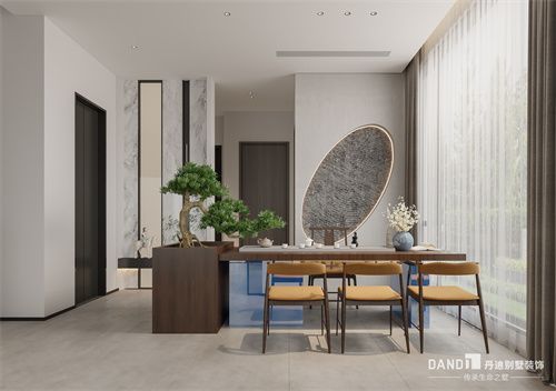 人间雅事,清风明月,读书作画,以现代风格家具、山川水墨画以及桌上水元素雕塑,共同围合一处天然净境。听古琴高远,鉴书画墨香,闻汩汩水沸,品茶色云卷云舒,人生闲适而雅致。人与物、物与空间、空间与人,彼此感化,一场形而上的山水人文精神体验。