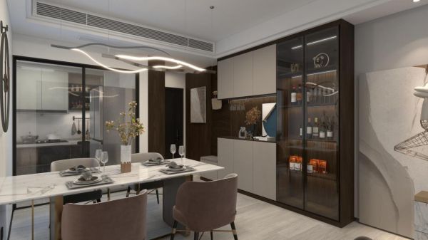 当时根据客户需求,为客户设计出现代简约风格。深色胡桃木纹理配备灰色柜门,让空间层次感更为丰富。背景墙装饰灯的让整个装修风格多一份温馨,装饰柜半开放格配以装饰品,增加空间艺术感,开放柜与悬空视听柜配以暖色灯光及增加了氛围感和色彩感。电视背景墙才用圣象柔石岩板,让整个大理石的纹理清爽,整洁。沙发背景墙选用大亚圣象芝士灰色系墙板,让墙板不在显得单一。加上落地装饰画及挂件的点缀,让客户在家休息时让舒适的色彩更为温馨。餐厅采用部分则采取镂空设计,让取拿物品更方便,超大的餐边柜每一层开放格与收纳柜、极窄灰玻门与胡桃柜的组合,加上隔板的灯带设计。让整个设计充满幸福感。