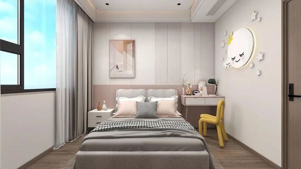 粉色系卧房中嵌入式墙板打造的床头及背景墙
