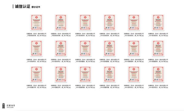 公司先后获得信用等级证书、诚信经营示范单位证书、资信等级证书、重合同守信用证书、质量服务信誉证书、诚信企业家荣誉证书、诚信经理人荣誉证书等证书以及“中国酒店家具质量标杆企业”、“中国酒店家具十佳诚信投标企业”称号,并在招投标供应链品牌推介平台举办的 “2022中国办公及商用家具评价推介活动”中,荣获“2022中国酒店家具十大品牌”和“2022中国高端定制酒店家具十大品牌”两大殊荣。