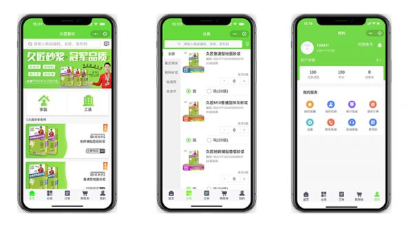 久匠砂浆优势显著,它不单局限于线下模式分销,更集中力量抓线上数字化转型,砂浆系列共有三大类别,7款产品,均实现线上采购、一站式配送。(如图)