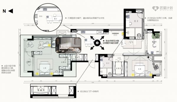 在接触到业主,并深入了解后,陈灵飞并没有选择按照原来的设计思路,而是重新根据业主的家庭需求进行设计的调整。陈灵飞介绍道:“他们住在靠湖的边上,我把卫生间全部都外拓了,来打造衣帽间,然后把他们的书房和梳妆台全部都结合在一起,让他们有更多能够接触的机会。”同时,陈灵飞也在观察业主之间的意见分歧,并从中寻找到了一丝共性,那就是有分歧的夫妻两人其实都很喜欢沐浴时的安宁。“我就利用了这个共性给他们做了一个超大的浴缸,把原来的景观阳台接入到了卫生间里面。”陈灵飞认为,最重要的是去找到业主亲密关系中的平衡点。
