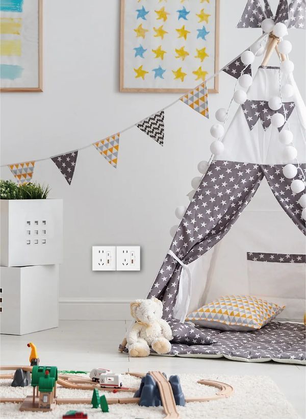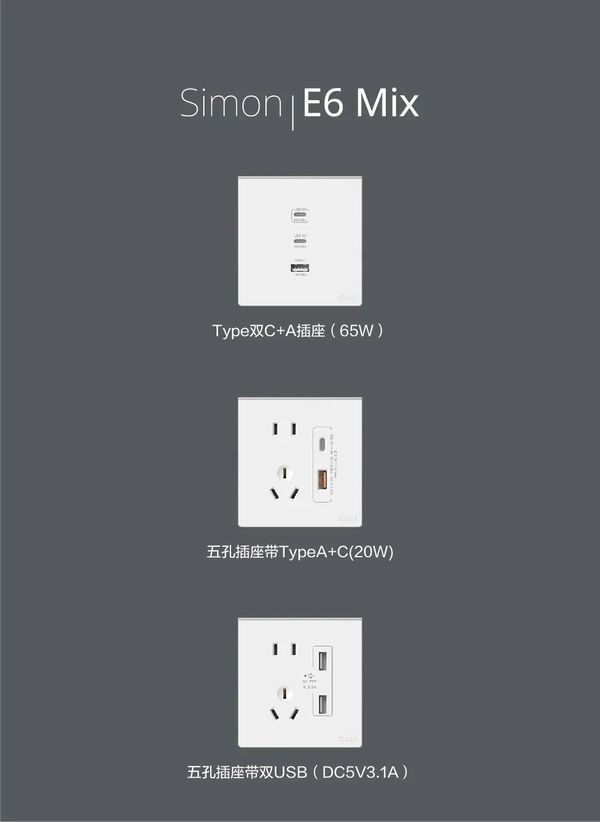 如果有快充需求,还可以配置Simon 五孔插座带Type A+C(20W)或Type双C+A插座(65W),支持自动识别大部分主流快充协议,多种接口,让生活即刻来电。安装布线与普通五孔开关一致,新房安装,随需预留好插座位即可,装修改造则可直接替换五孔插座,实现原位快速升级。